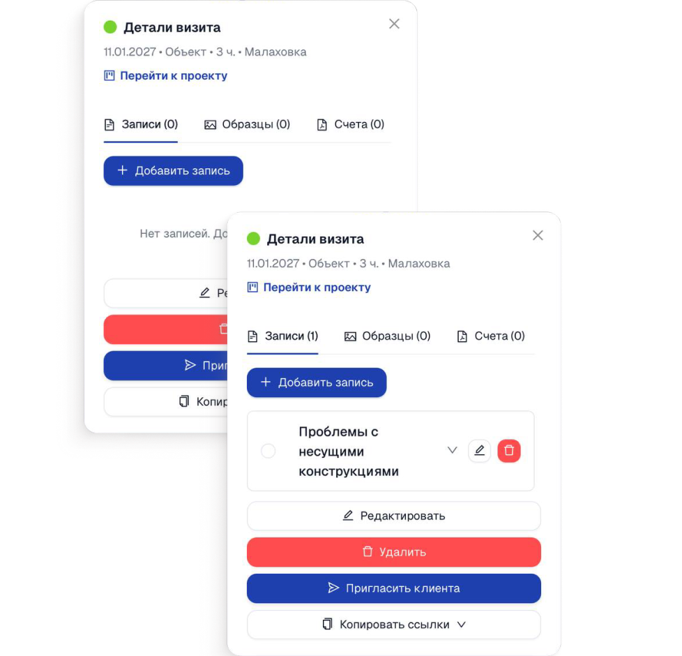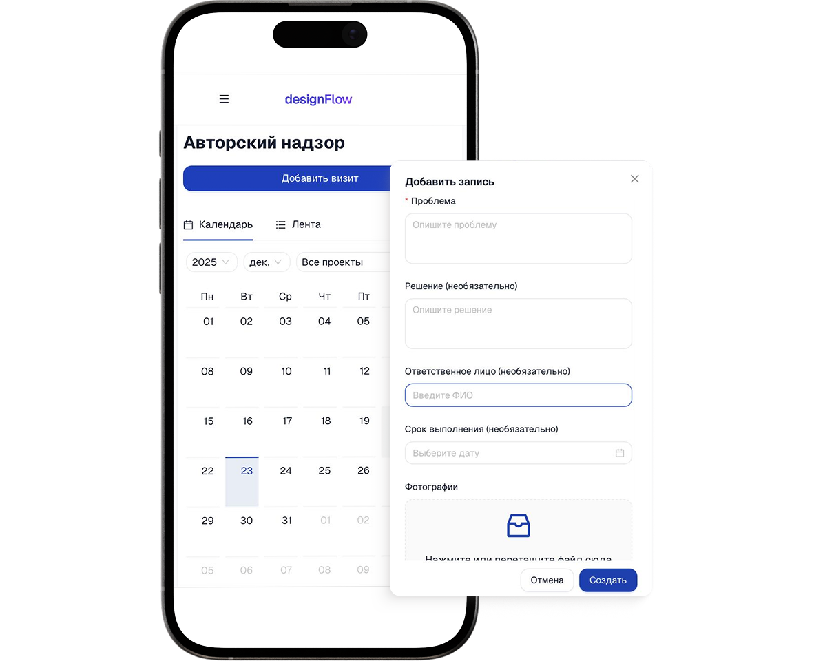 Фиксируйте выезды, задачи, замечания, фото и согласования — в единой системе, с привязкой к дате, где ничего не потеряется и клиент всегда видит прозрачный процесс.