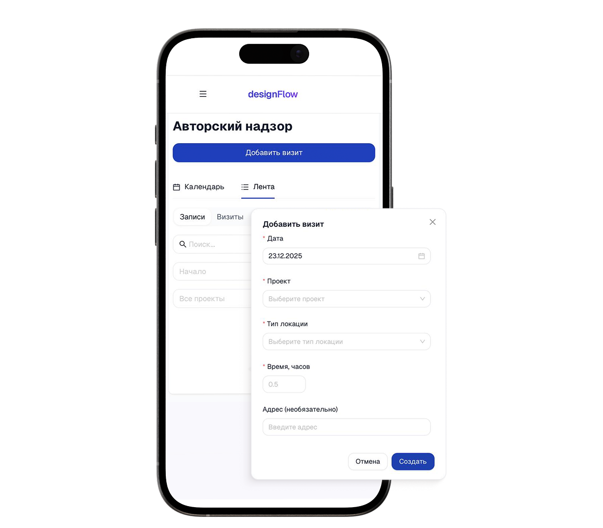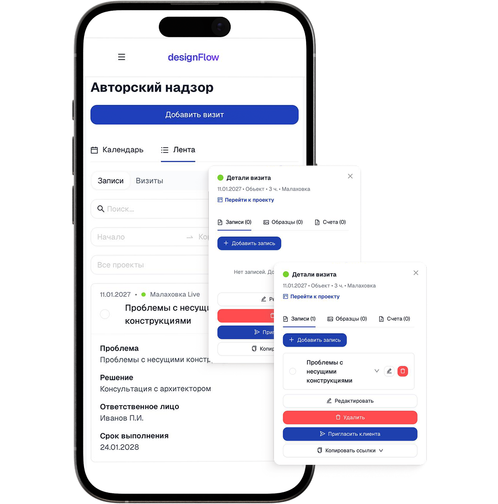 Фиксация выездов, замечаний и решений в одном месте — прозрачно для клиента, удобно для дизайнера.